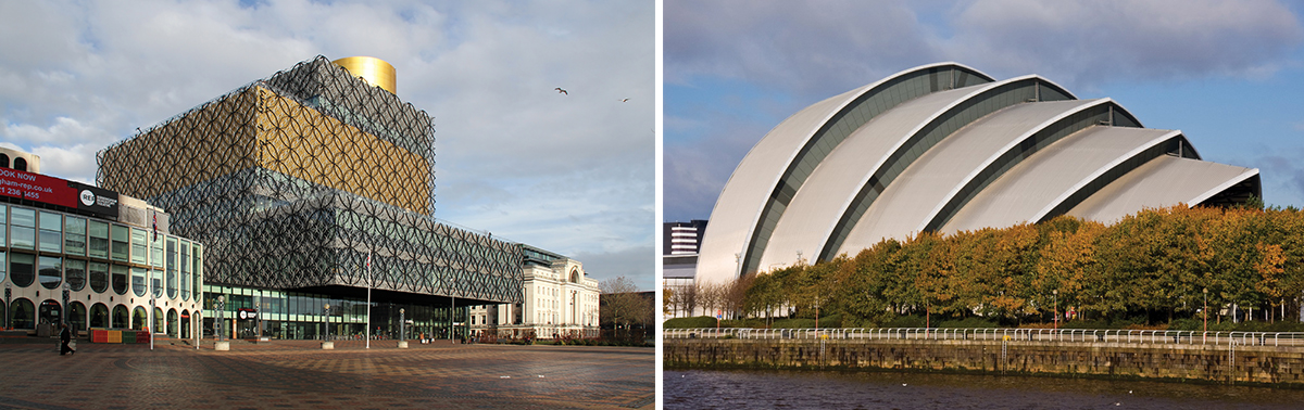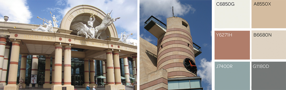 Το Κέντρο Trafford στο Manchester, είναι ένα καλό παράδειγμα μεταμοντέρνας αρχιτεκτονικής. ‘Εχει αναφορές σε Ρωμαϊκά και Ελληνικά γλυπτά, νεοκλασικές κολώνες και ένα θόλο που μοιάζει με τον Καθεδρικό του Αγίου Παύλου. Τα σχήματα και τα στυλ είναι μικτά με επιρροή από παντού, τα ιστορικά στυλ έχουν μπερδευτεί, το χρώμα είναι εκφραστικό και το αποτέλεσμα είναι αντικομφορμιστικό. Το στυλ περιβάλλεται από αντιφάσεις και μερικοί κριτικοί εναντιώνονται στην υπερβολική προσέγγιση του μεταμοντερνισμού, ενώ άλλοι βλέπουν ότι έχει εναντιωθεί σε παλιές ιδέες αρχιτεκτονικής, χωρίς να απολογείται για το ότι τόλμησε να είναι διαφορετικός.