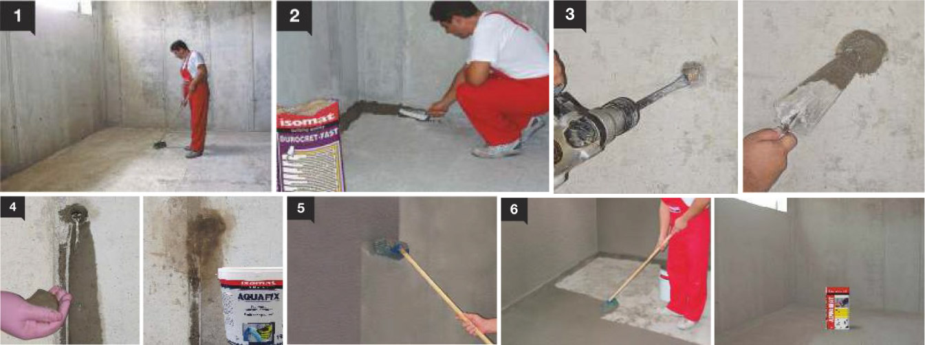 Στα περιμετρικά τοιχία, διανοίγουμε κωνικά, με το κρουστικό δράπανο, τα μορέλα και τις φουρκέτες, σε βάθος 3 cm και στοκάρουμε με DUROCRET ή DUROCRET-FAST. Με τα ίδια υλικά στοκάρουμε και τυχόν αρμούς διακοπής εργασίας (εφόσον διανοιχθούν κατά μήκος, τριγωνικά και σε βάθος 3 cm), καθώς και οι υπάρχουσες φωλιές στο σκυρόδεμα. Αν κατά τη διάρκεια των εργασιών παρατηρηθεί εισροή νερού, σφραγίζουμε τα συγκεκριμένα σημεία με το υπερταχείας πήξης σφραγιστικό τσιμέντο AQUAFIX.