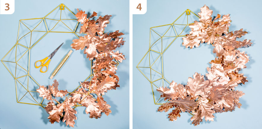 Βήμα 3ο: Μόλις στεγνώσουν πλήρως, συνδέστε τα φύλλα σας στο στεφάνι χρησιμοποιώντας σύρμα χειροτεχνίας, τοποθετώντας τα φύλλα μέχρι να είστε ευχαριστημένοι με το σχέδιό σας.