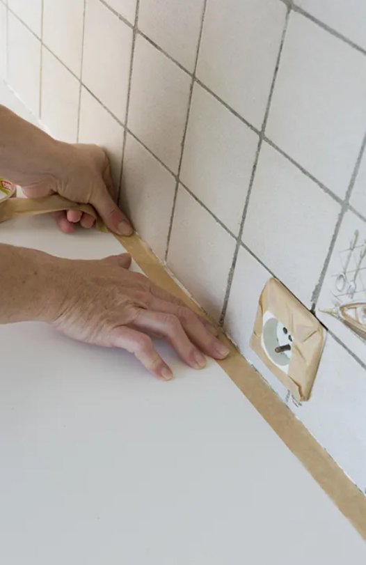 Ανακατέψτε το Kitchen Renovation Paint με ένα φαρδύ ραβδί. Χρησιμοποιώντας ένα πινέλο, εφαρμόστε πρώτα το χρώμα στις άκρες και τις γωνίες. Στη συνέχεια βάψτε τους αρμούς των πλακιδίων. Ξεκινήστε να βάφετε γύρω από την κολλητική ταινία, από έξω προς τα μέσα.