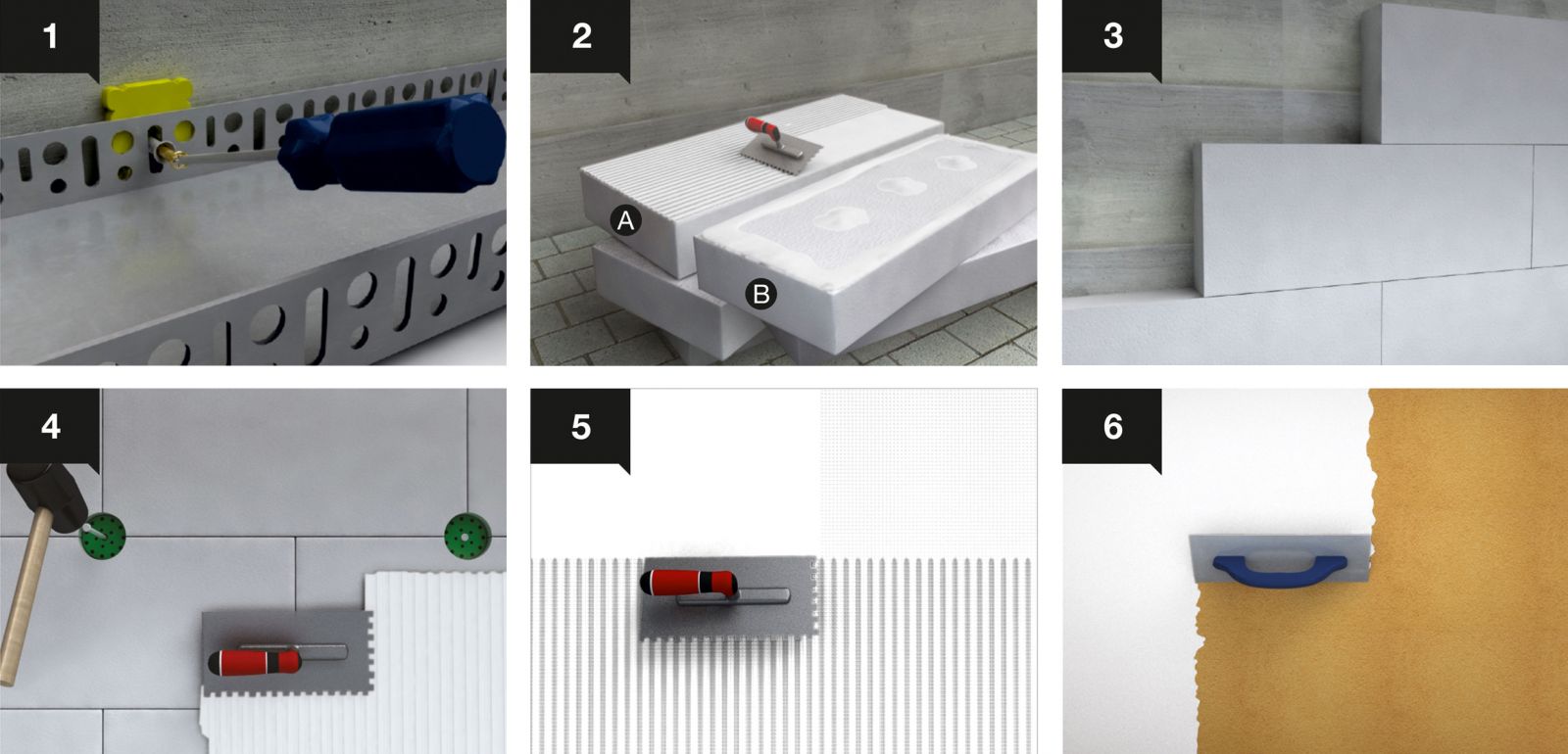 3. Οι θερμομονωτικές πλάκες επικολλούνται σε οριζόντιες επάλληλες στρώσεις, από κάτω προς τα πάνω, σε διάταξη διασταυρούμενων αρμών, ώστε να αποφύγουμε τον κίνδυνο ρηγματώσεων του τελικού σοβά.