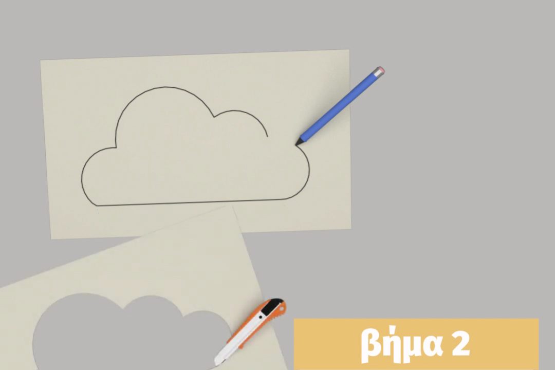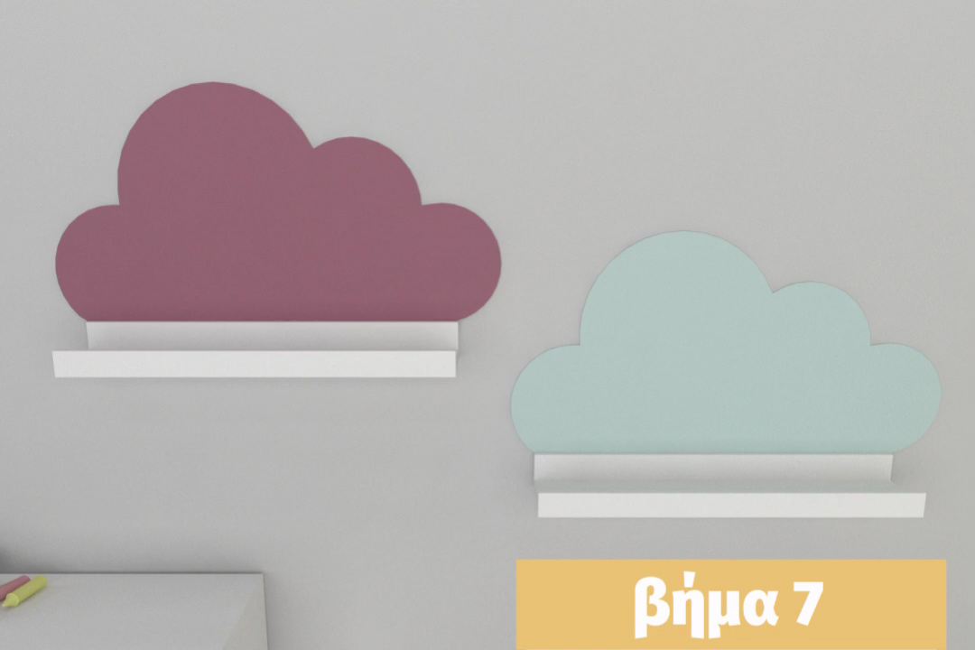 Σχεδιάζουμε σε ένα χαρτόνι ένα σύννεφο προσέχοντας την βάση του να έχει ίδιο μήκος με το ράφι μας και έπειτα κόβουμε το περίγραμμα με ένα χαρτοκόπτη.