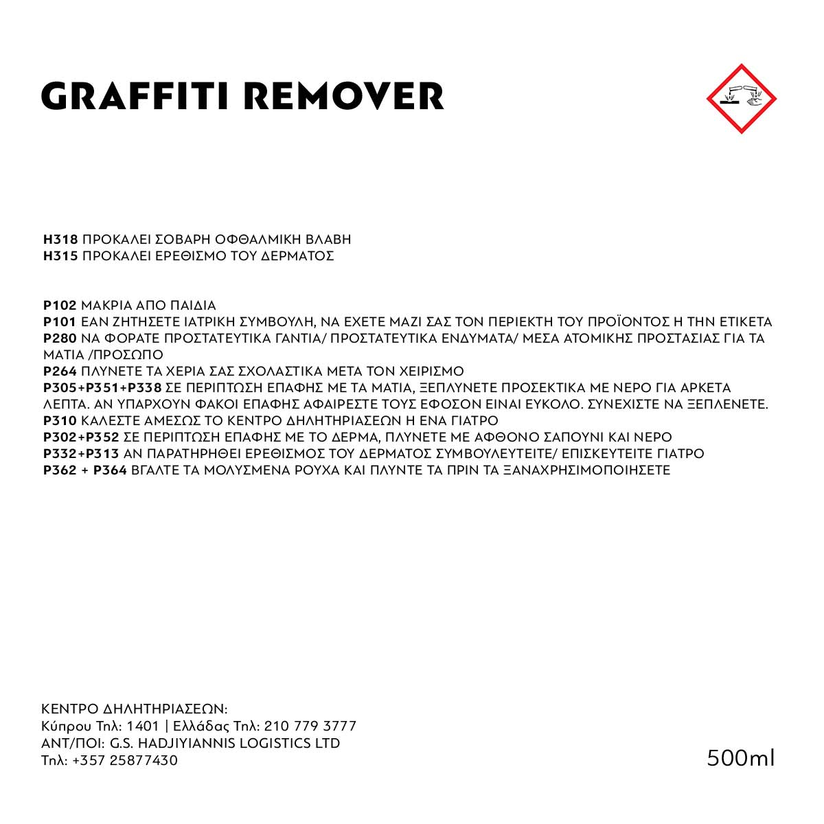 Ειδικό καθαριστικό αφαιρετικό μελάνης από graffitti, μαρκαδόρο ή στυλό, σοβατισμένους τοίχους, πέτρα, μεταλλικές- πλαστικές επιφάνειες, γυαλί, κεραμικά πλακάκια, μάρμαρα. Ιδανικό για τον καθαρισμό αγαλμάτων, μνημείων, παιδικών δωματίων, θρανίων, εκπαιδευτικών ιδρυμάτων, όψεων κτηρίων.