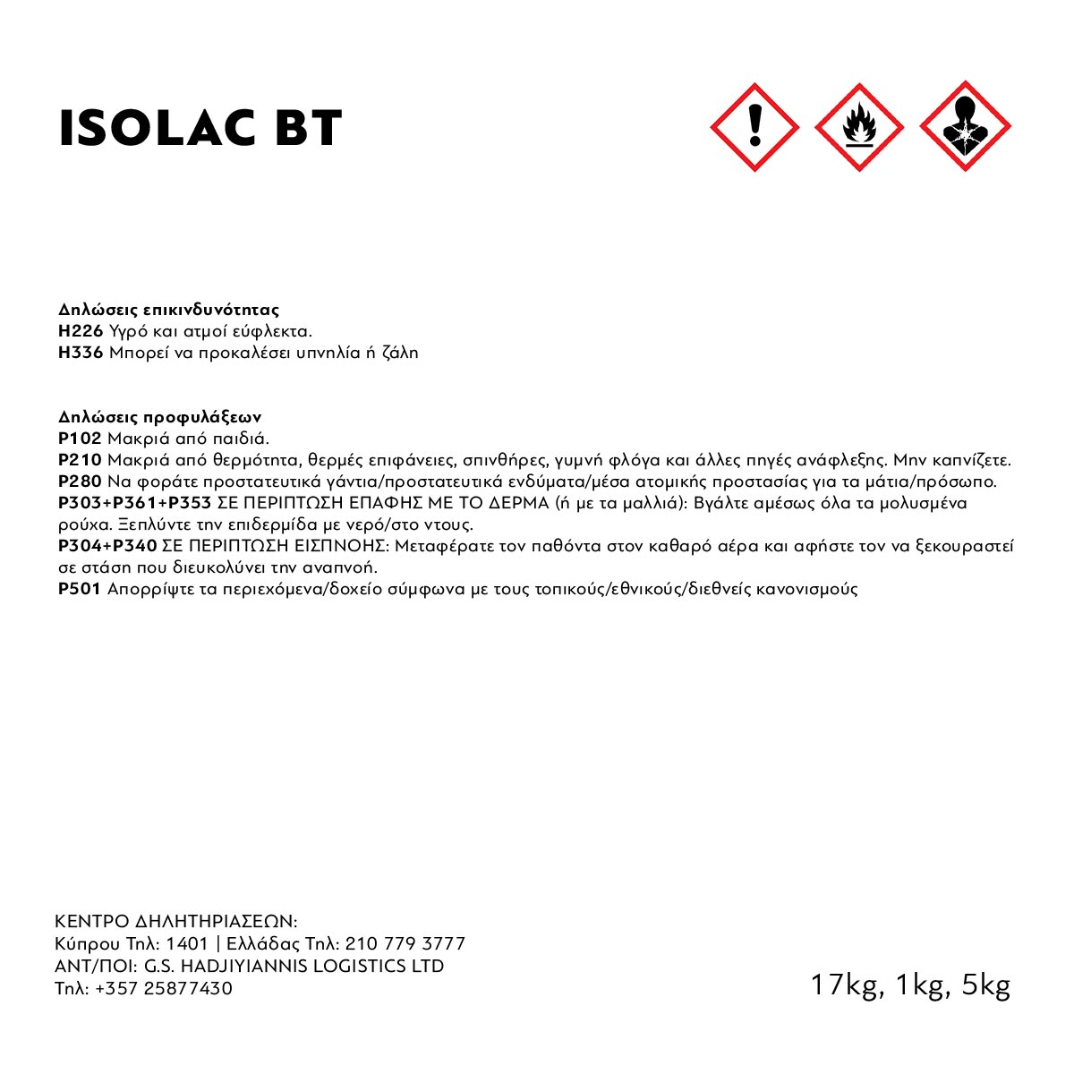 Το Isolac-BT είναι ασφαλτικό στεγανωτικό βερνίκι με διαλύτες με εξαιρετική πρόσφυση σε όλες τις επιφάνειες.