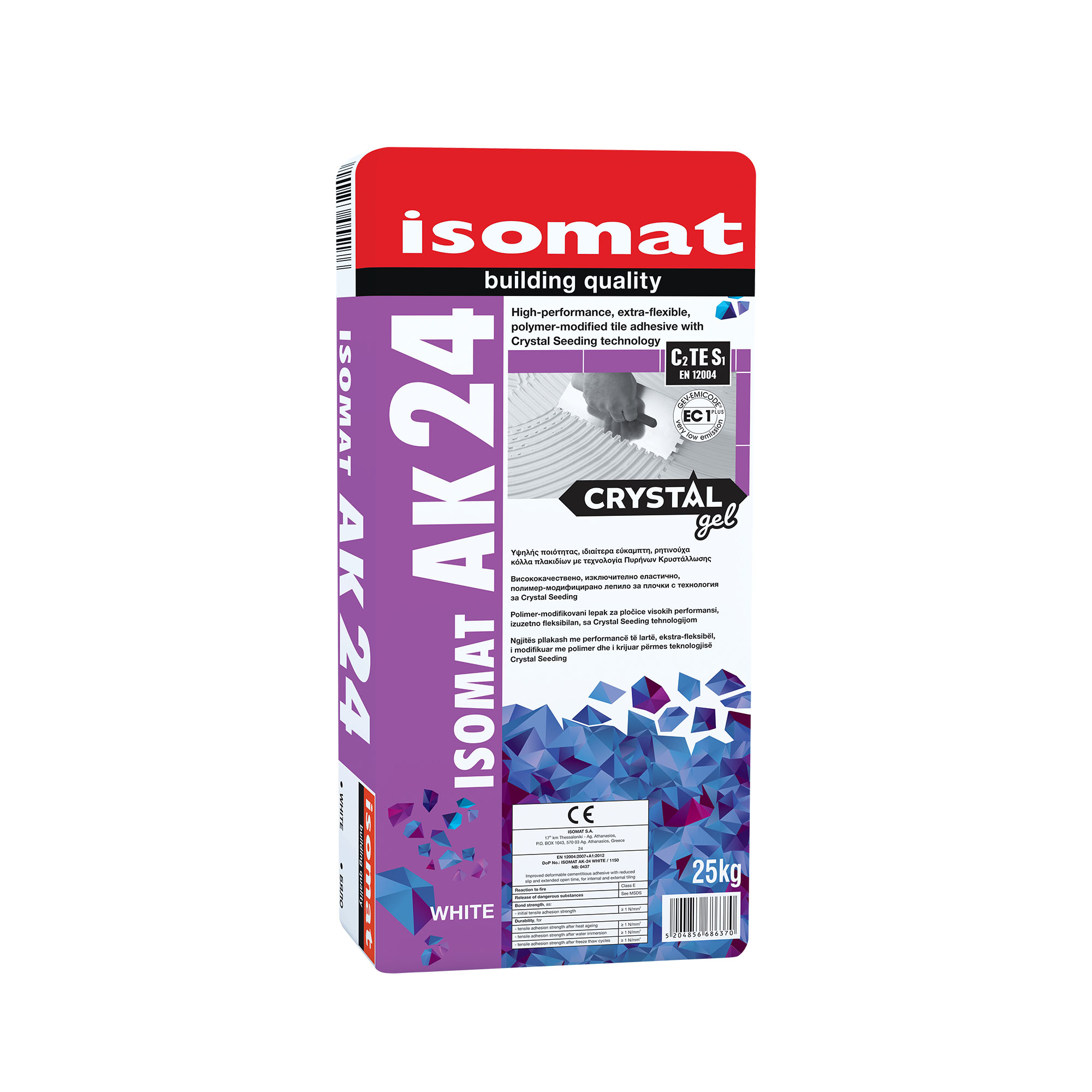Η ISOMAT AK-24 CRYSTAL GEL είναι υψηλής ποιότητας, ιδιαίτερα εύκαμπτη ρητινούχα κόλλα πλακιδίων με τεχνολογία Crystal Gel, η οποία συνδυάζει την τεχνολογία Πυρήνων Κρυστάλλωσης και τα χαρακτηριστικά Gel σε ένα προϊόν.