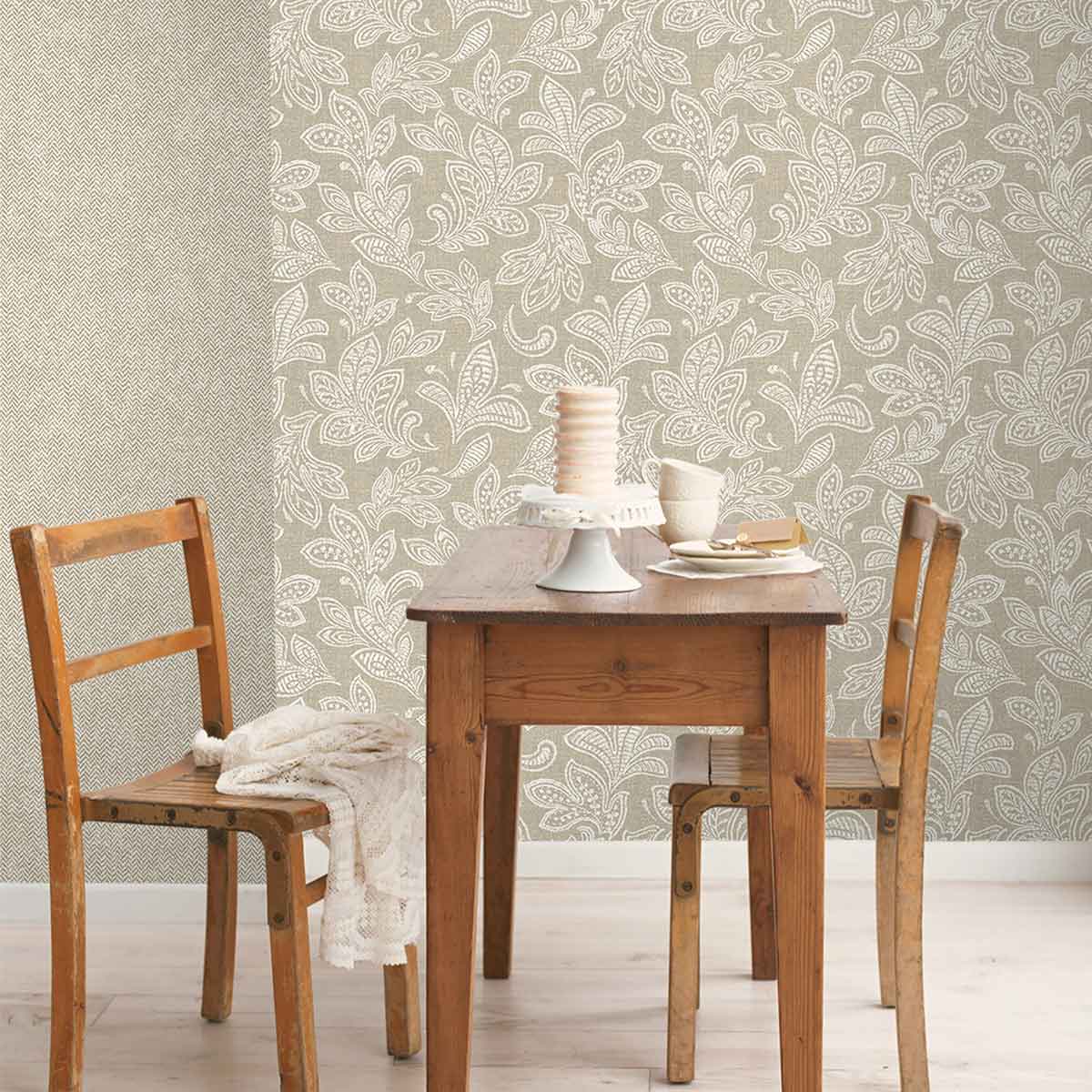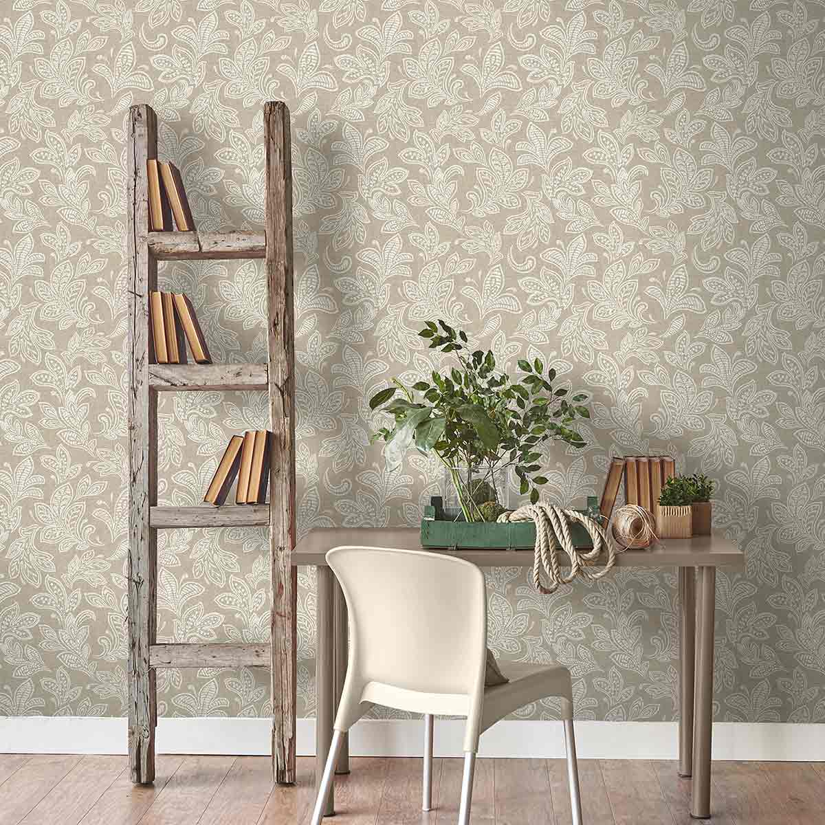 Ταπετσαρία με φύλλα που σχηματίζει ένα διακριτικό υφασμάτινο μοτίβο.