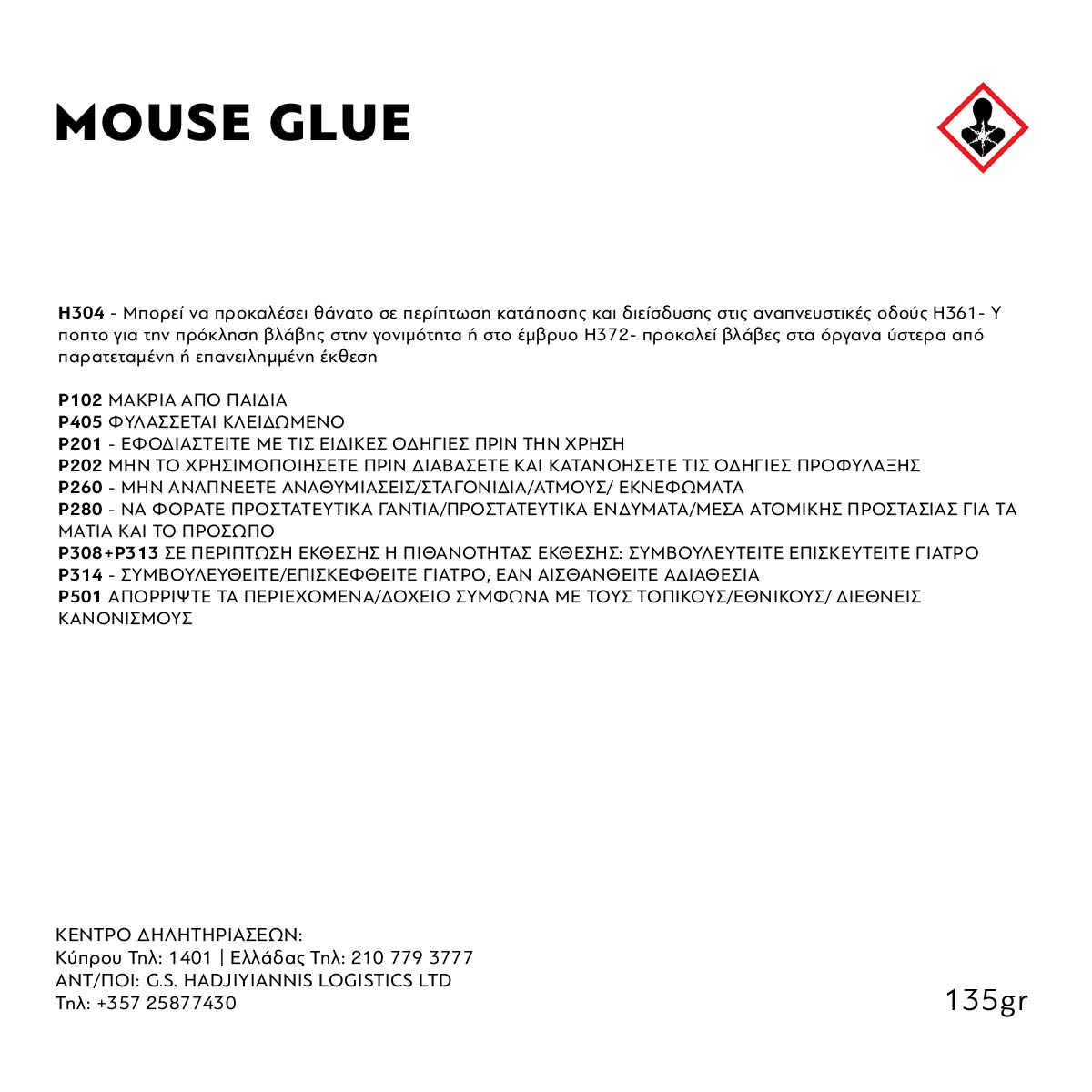 Ισχυρή κόλλα μεγάλης αντοχής σε σωληνάριο, εύκολη στην χρήση με αντοχή στο νερό και τη θερμοκρασία. Φτιάξτε μια παγίδα μόνοι σας (με το περιεχόμενο μπορείτε να φτιάξετε 2-3 παγίδες), απλώστε την κόλλα σε χαρτόνι με κυκλικές ή παράλληλες γραμμές και τοποθετήστε στο κέντρο της αυτοσχέδιας παγίδας ένα κομμάτι τυρί ως δόλωμα. Εξασφαλίζει την απαλλαγή από μικρά ή μεγάλα ποντίκια με την μέθοδο της ακινητοποίησης.