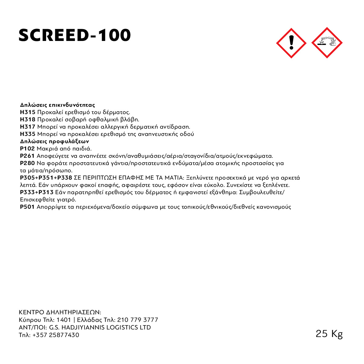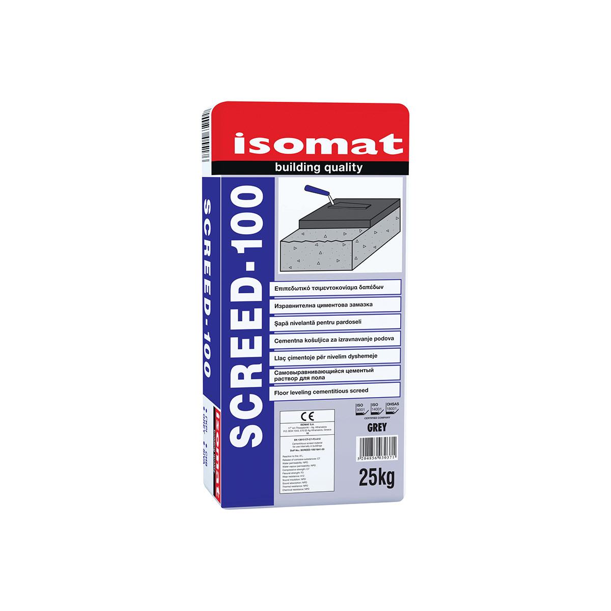 Τσιμεντοκονίαμα Screed-100, για γέμισμα και επιπέδωση δαπέδων που πρόκειται να επιστρωθούν με πλακίδια, μάρμαρα, κολλητά δάπεδα κτλ., καθώς και για δημιουργία κλίσεων σε δώματα. Αντικαθιστά το άοπλο σκυρόδεμα ή το ελαφρομπετόν. Εφαρμόζεται σε πάχος έως 100 mm ανά στρώση. Κατατάσσεται ως CT-C7-F3-A12 κατά ΕΝ 13813.