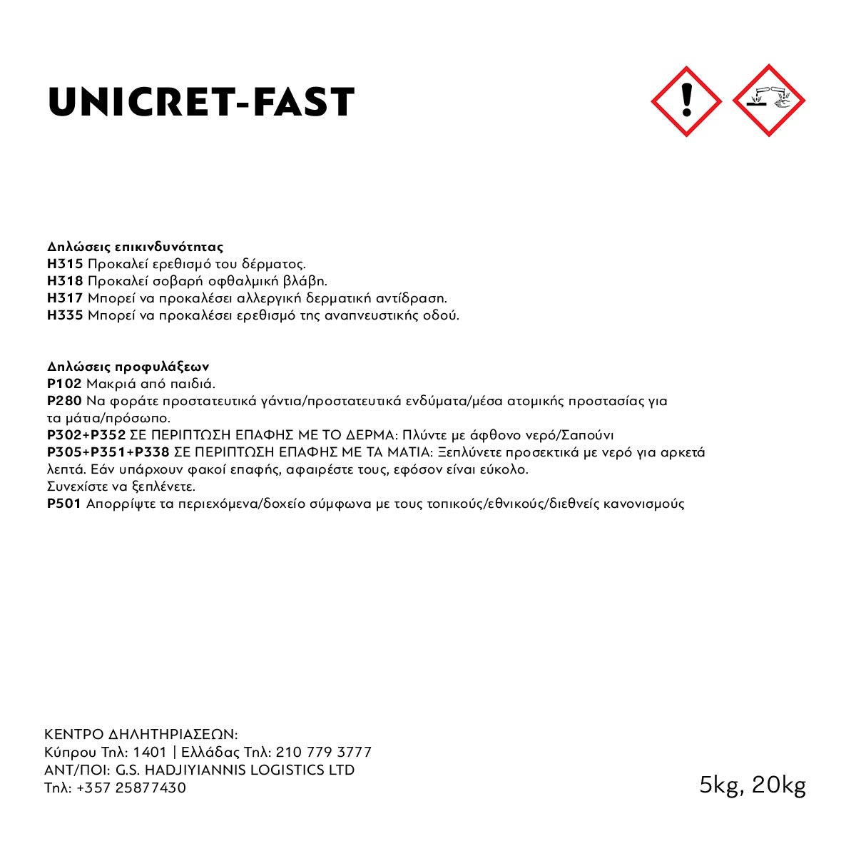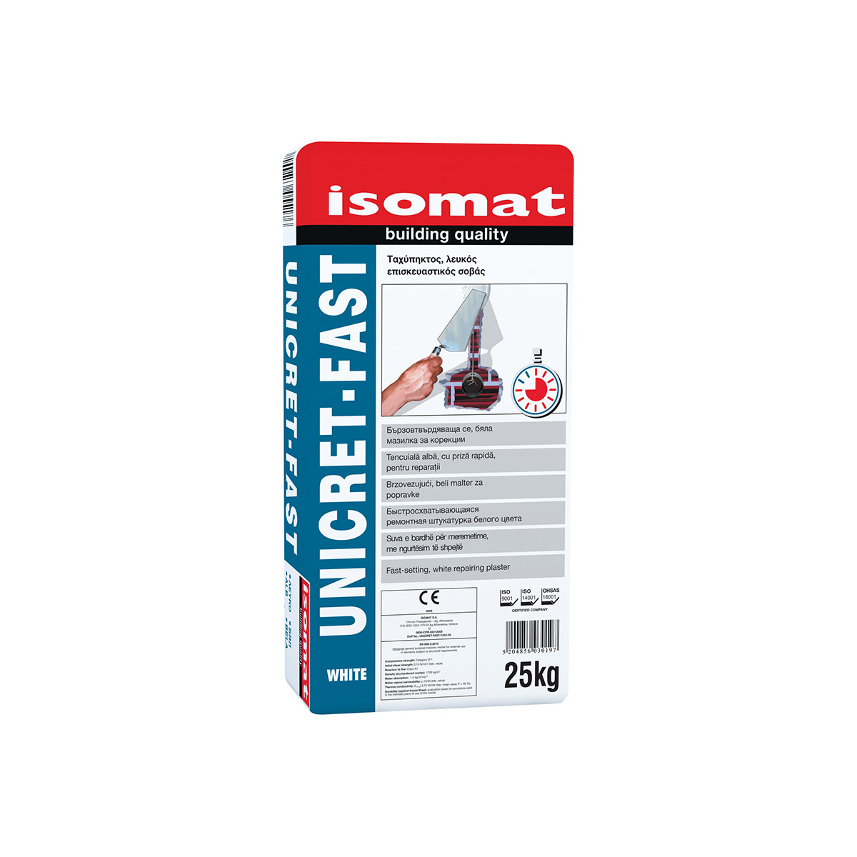 Ταχύπηκτος, λευκός επισκευαστικός σοβάς Unicret-Fast. Ιδανικός για γρήγορες επιδιορθώσεις σοβάδων σε παλιές και νέες κατασκευές. Πιστοποιημένο με τη σήμανση CE ως κονίαμα τύπου GP CS II, W0 κατά ΕΝ 998-1 και σύμφωνα με το πρότυπο ΕΝ 998-2, ως κονίαμα τοιχοποιίας για εξωτερική χρήση, σε κατασκευές που υπόκεινται σε δομικές απαιτήσεις.