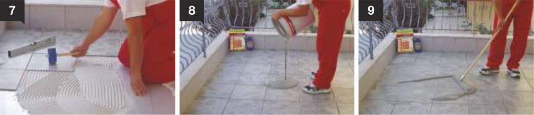 5 & 6. Then we place the tiles and press them in the preferred position, keeping the selected width of the joints constant with the help of grouting crosses.