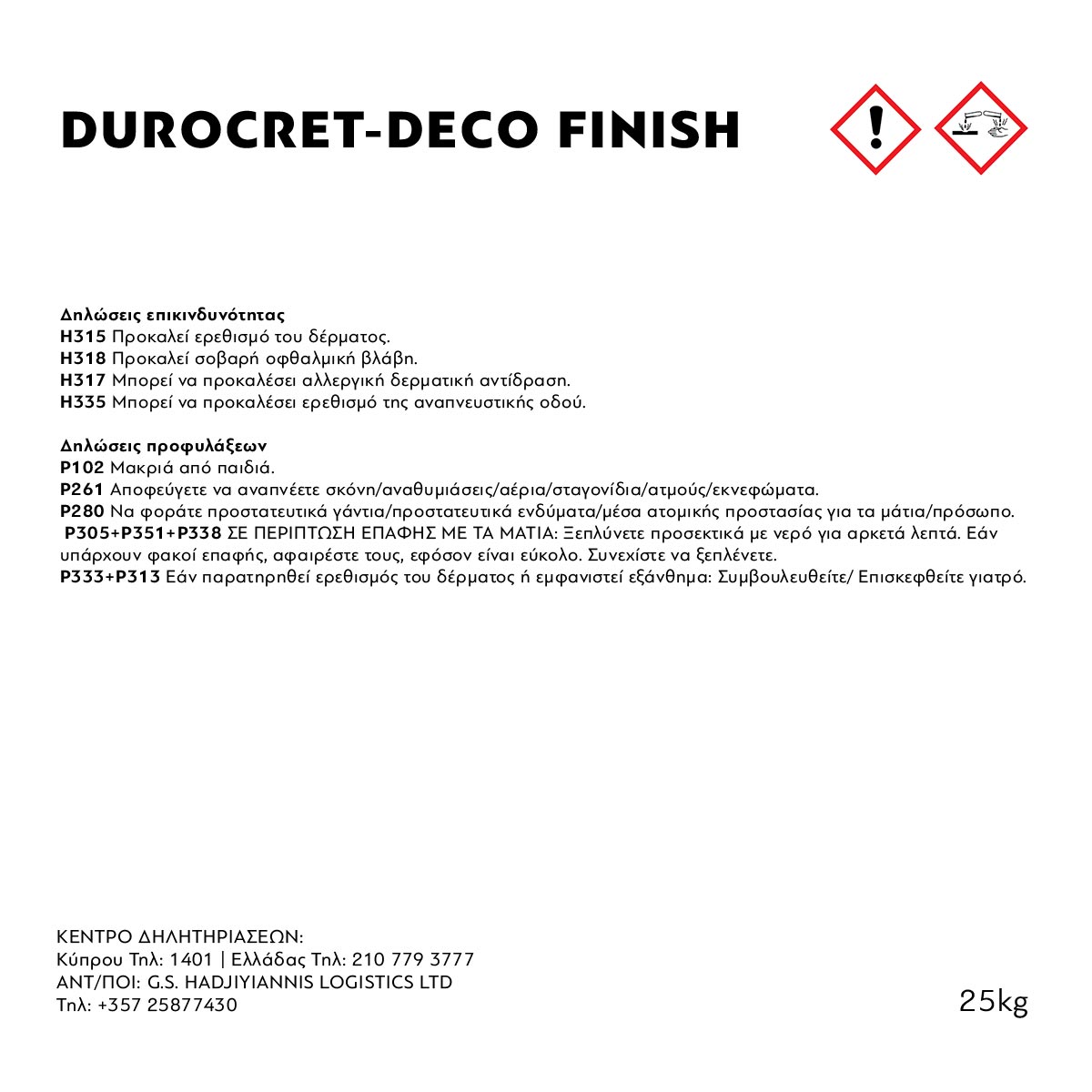 Durocret-Deco Finish is a premade, fine grained cement mortar with resin, without corrosive ingredients, for indoor or outdoor use on floors and walls.