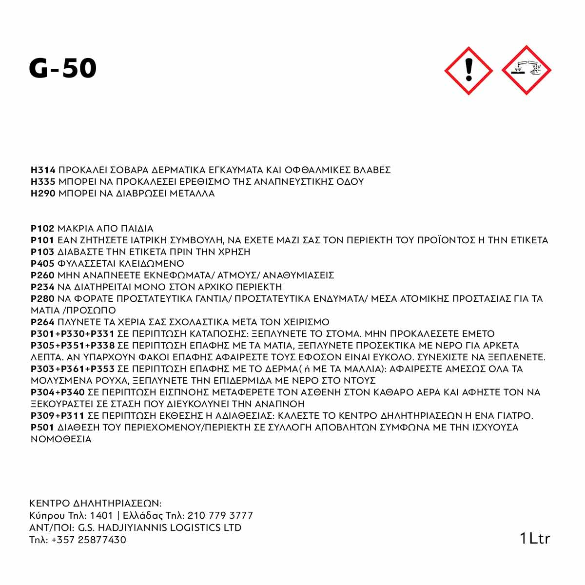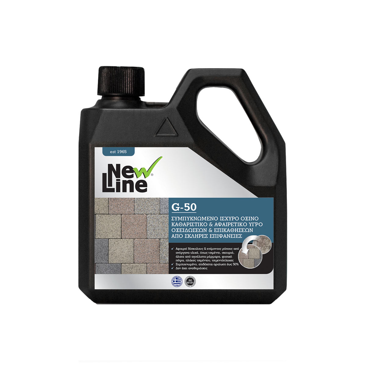 G-50 is a concentrated strong acid cleaner & remover of oxidation and substances on surfaces which come in contact with water such as non-polished marble, natural stone, cement tiles and ceramic tiles. Undoubtedly the main feature of the G-50 is its high concentration that allows it to be used in large dilutions. It is fully effective on difficult and persistent colored stains, such as rust, accumulated salts, mud, etc. It stands out from common cleaners due to its fast and effective action.