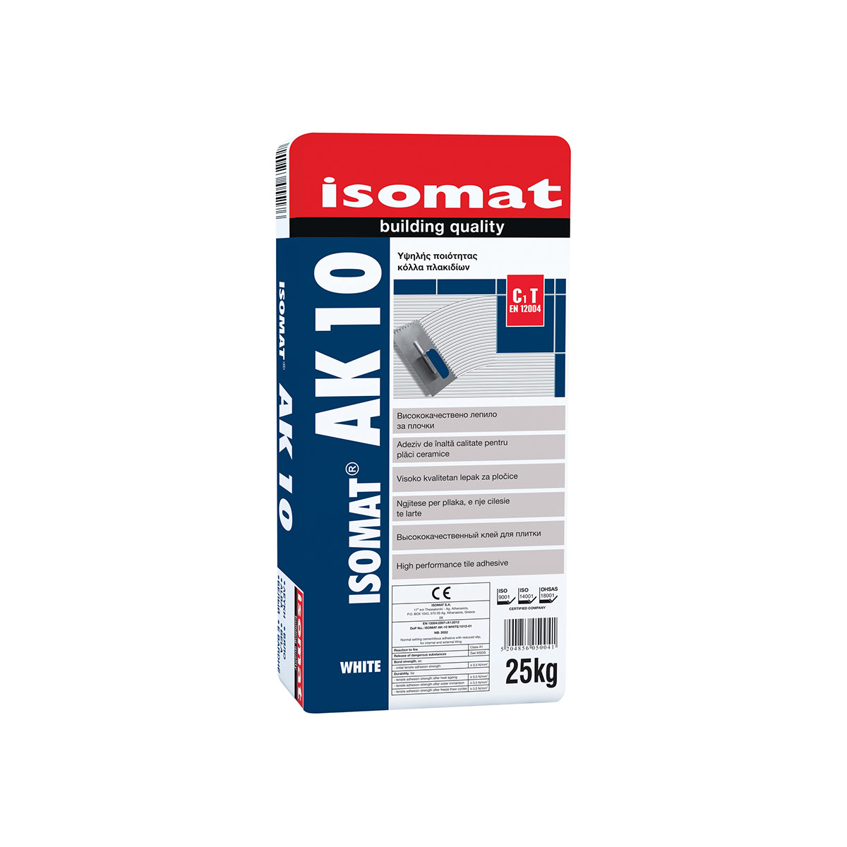 Isomat AK-10 is a cement-based tile adhesive with no vertical slip. Certified according to EN 12004 and classified as C1 T adhesive. CE marked.