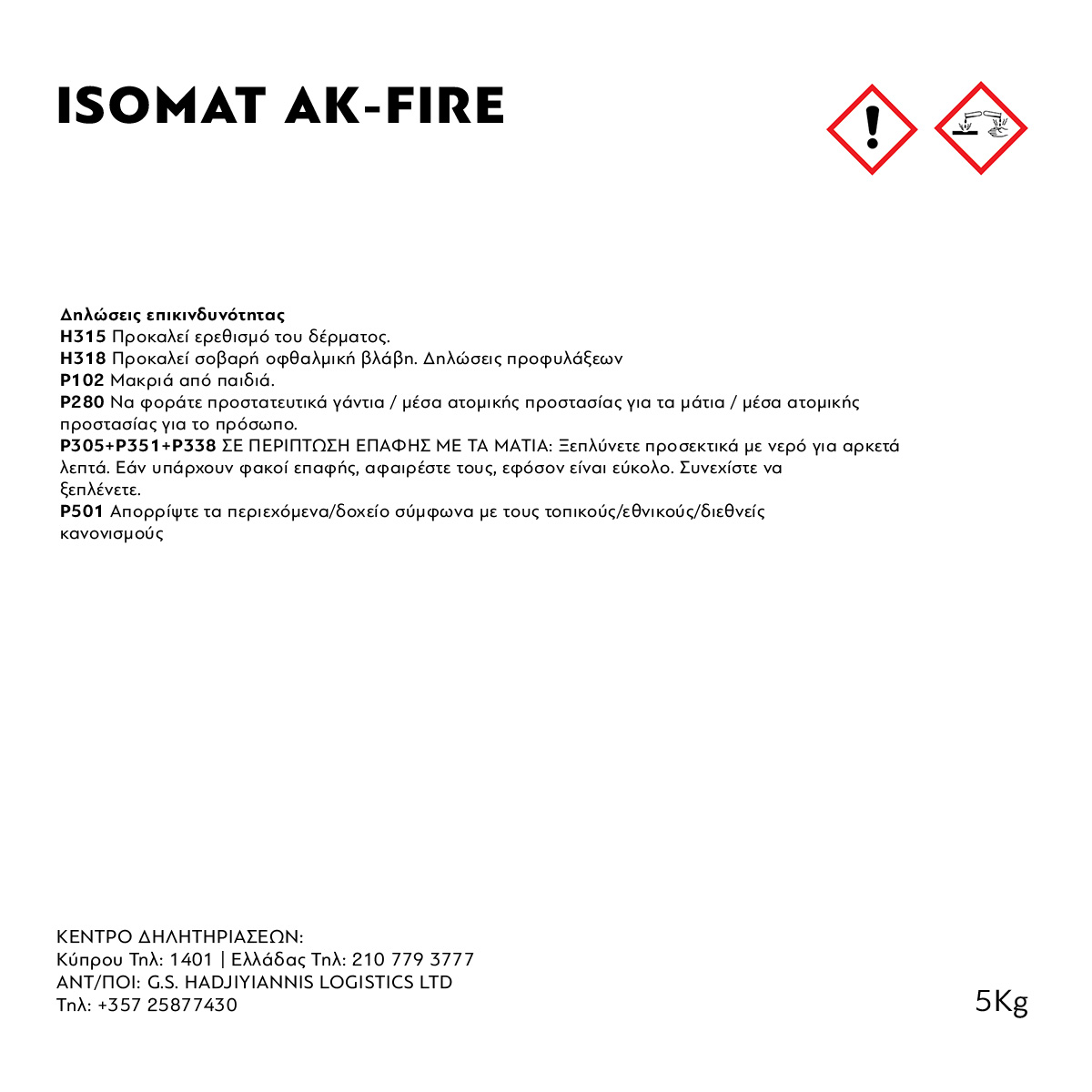Isomat AK-Fire is a high-quality cementbased mortar for firebricks. Composed of high alumina cement with carefully graded quartz aggregates. Certified according to EN 998-2 and classified as a designed general purpose masonry mortar, for external use, in elements subject to structural requirements. CE marked.