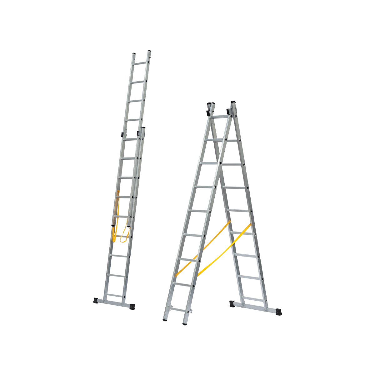 Aluminium 2 section combination ladder. Easy-to-use mechanism to transform the ladder in standing position