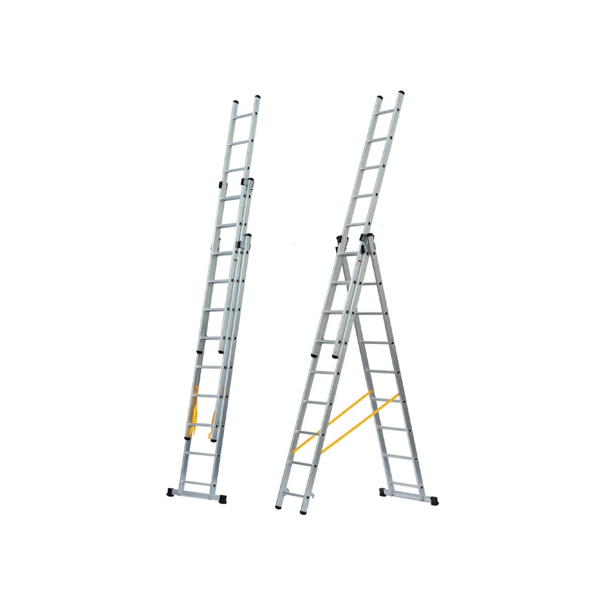 Aluminium 3 section combination ladder with easy-to-use mechanism to transform the ladder in standing position.